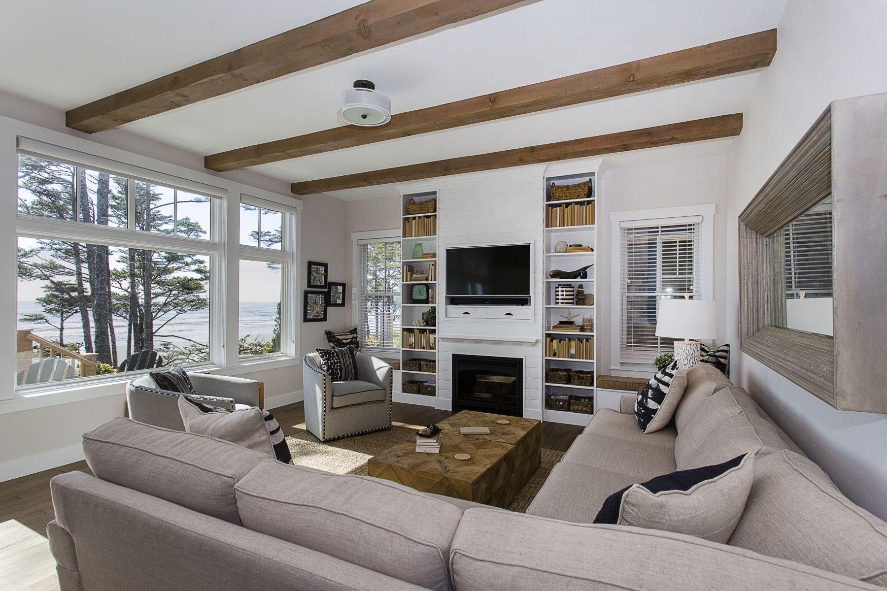 Architectural details like white-washed built-in shelving, wood-clad ceilings, or wall paneling give coastal homes a sense of craftsmanship and permanence. These features provide the perfect stage for displaying curated coastal finds like sea glass, ceramics, or woven baskets.