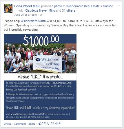 With a total of 206 likes and comments on their photo, the winner of the CSD Facebook photo challenge is Windermere North (Lynnwood)! Owner, Lena Maul, and her team will be donating the $1,000 prize to “Pathways for Women” which provides shelter for homeless women and their children through their local YWCA.