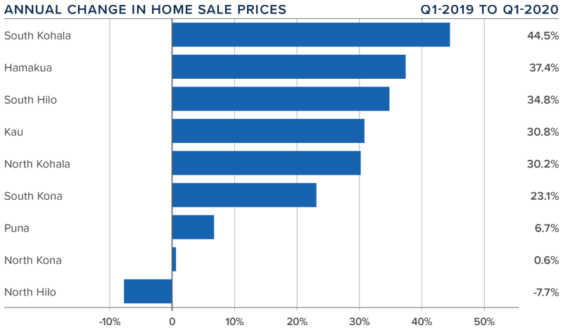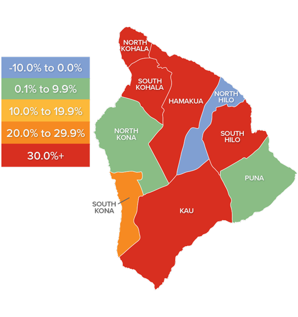 • Prices rose in all market areas other than North Hilo. Appreciation was strongest in the small South Kohala market area. All other areas except North Kona saw significant increases.