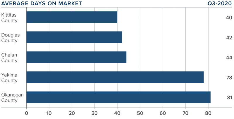 - Okanogan, Douglas, and Kittitas counties saw the length of time it took to sell a home drop compared to a year ago. Market time rose modestly in Yakima and Chelan counties.
