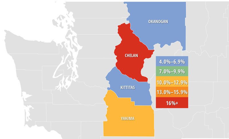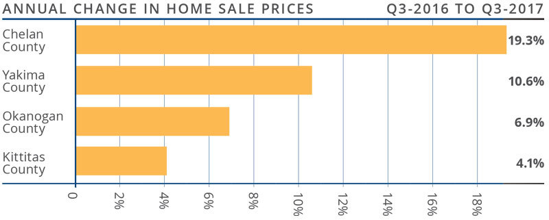 - All counties in this report saw prices rise when compared to the third quarter of 2016. Chelan County led the way with an increase of 19.3%.