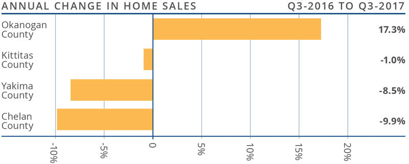 - Home sales throughout Central Washington were a mixed bag in the third quarter. Only one county saw sales rise compared to a year ago and three markets contracted. In total, there were 1,205 home sales in the quarter—a drop of 4.3% from the same period in 2016 but an increase of 3.1% over the second quarter of this year.