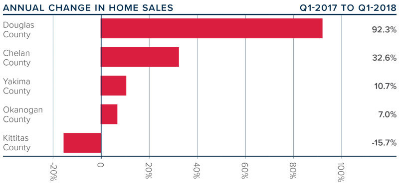- Home sales throughout Central Washington were generally higher in the first quarter of the year; four out of five counties saw growth in sales. In total, there were 859 home sales in the quarter—an increase of 13.5% from the same period in 2017.