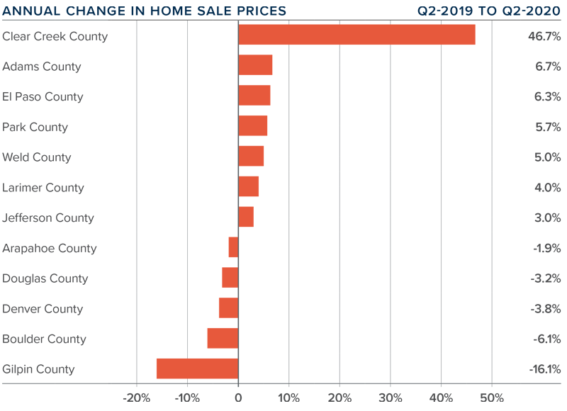 - Price growth across the region was varied. Seven counties saw price growth and five experienced a drop in average sale price. Clear Creek County again saw prices rise substantially. However, as you are likely aware, it is a very small market and subject to wild swings. Prices dropped most in the equally small Gilpin County.