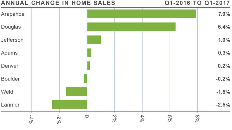- Arapahoe County saw sales grow at the fastest rate over the past 12 months, with a 7.9% increase. There were also impressive increases in Douglas County. There were very modest sales declines in the relatively small Larimer and Weld Counties.