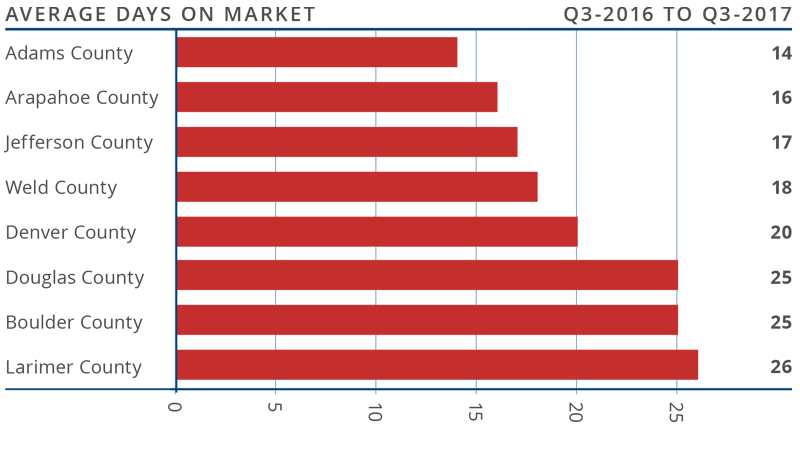 - Homes in all counties contained in this report took less than a month to sell. Adams County continues to stand out as it took an average of just two weeks to sell a home there.