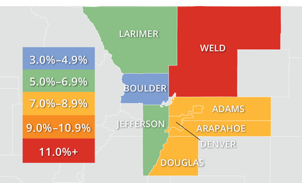 - Appreciation was strongest in Weld County, which saw prices rise 12%.