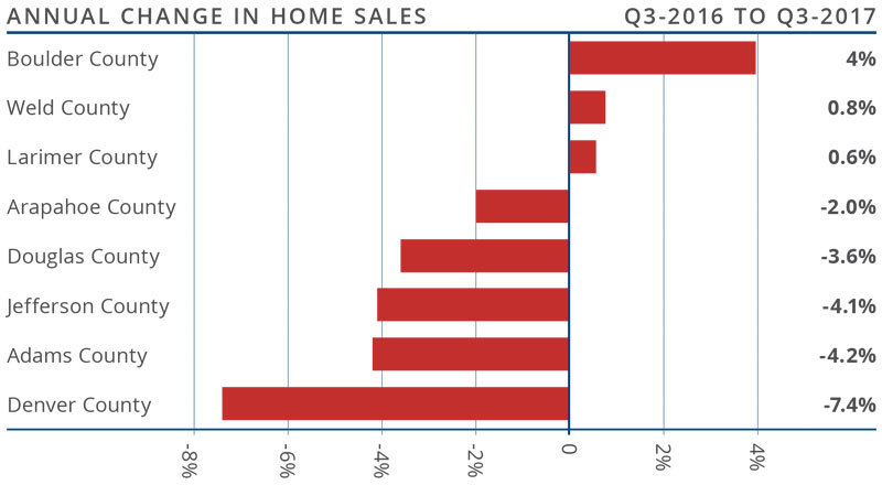 - Sales rose the fastest in Boulder County, which saw sales grow 4% more than the third quarter of 2016. There were marginal increases in Weld and Larimer Counties. Sales fell in all the other counties contained within this report.