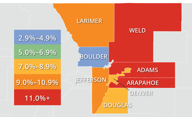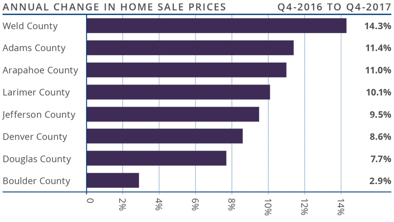 - Appreciation was strongest in Weld County, which saw prices rise 14.3%. There were also solid gains in almost all other counties considered in this report.