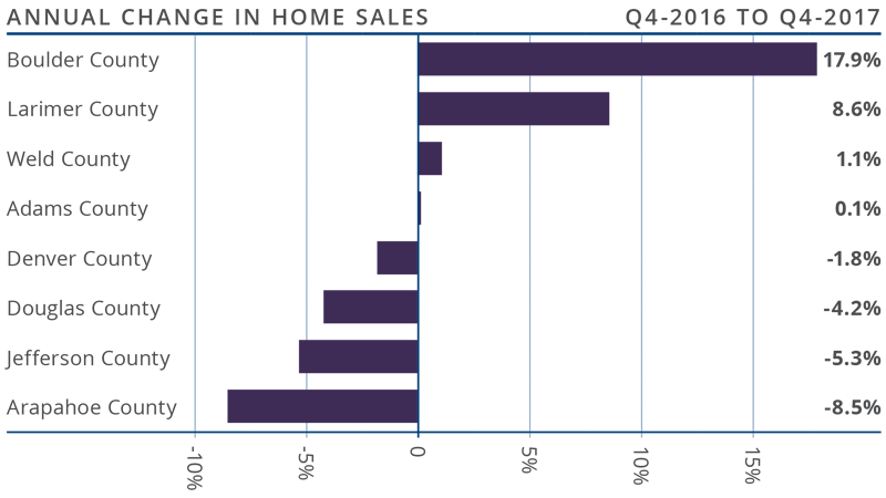 - Sales again rose the fastest in Boulder County, which saw sales grow 17.9% versus the third quarter of 2016. There were also reasonable increases in Weld and Larimer Counties. Sales fell in all other counties contained within this report because there is such a shortage of available homes for sale.