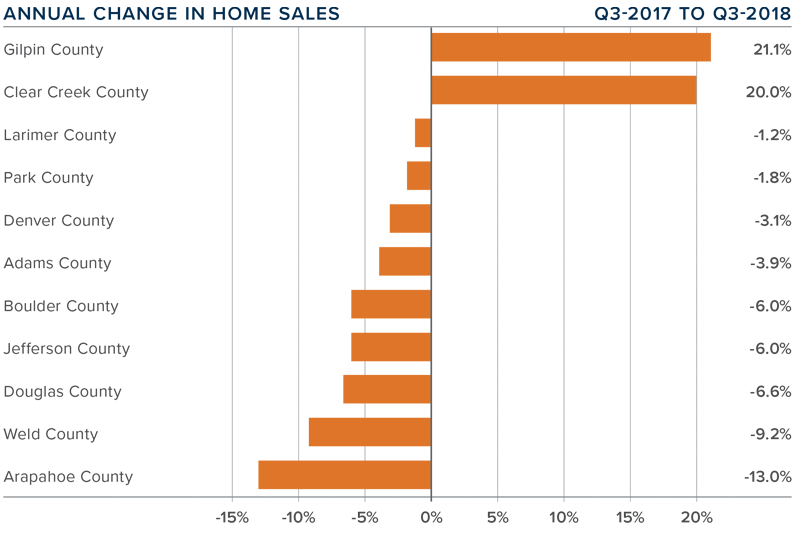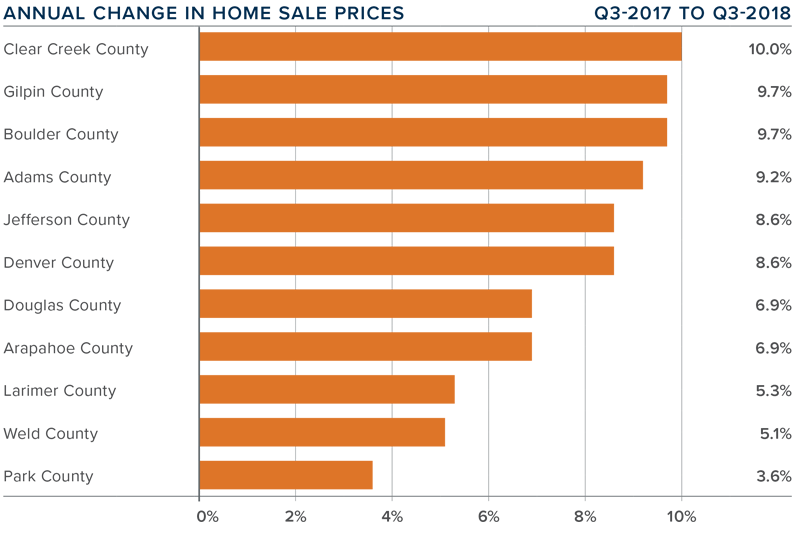 Appreciation was strongest in Clear Creek County, where prices rose 10%. All other counties in this report saw gains relative to the third quarter of 2017.