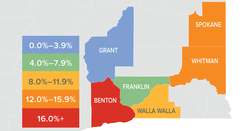Sales rose at the fastest rate in Whitman County, which increased 64.6% over a year ago. However, because that market is relatively small, a modest shift in sales can dramatically change the rate of growth in either direction.