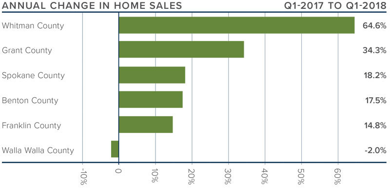 - Year-over-year, home sales rose in all counties except Walla Walla, where there was a very modest drop. In total, there were 2,545 home sales in the first quarter.
