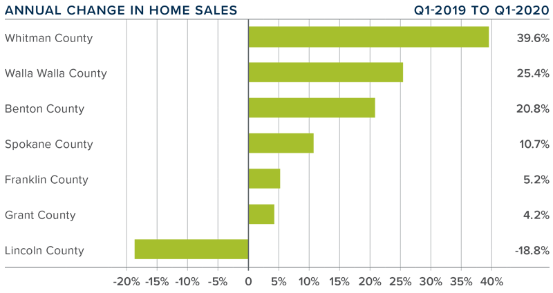 - Home sales throughout Eastern Washington were up 13% compared to the same quarter in 2019, with a total of 2,389 closed sales.