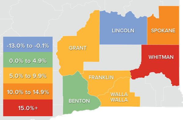 - Prices rose in every county other than Lincoln. Whitman and Spokane counties showed double-digit gains.
