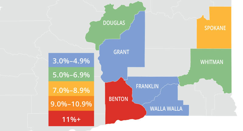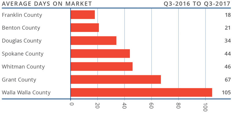- Grant and Whitman Counties had the biggest drop in days on market. Homes sold 26 days faster in Grant County and 24 days faster in Whitman County than at this time last year.