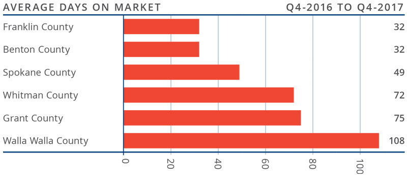 • Spokane County had the biggest drop in days on market. The time it took to sell a home there dropped by seven days compared to the fourth quarter of 2016.