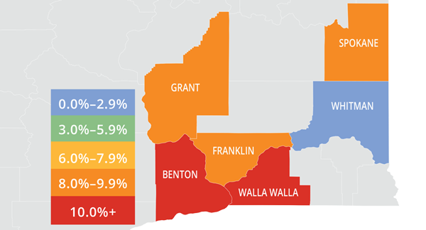 • Sales rose at the fastest rate in Walla Walla County, which increased 15.2% over a year ago. That said, the market is relatively small, so a slight shift in sales can dramatically change the numbers.