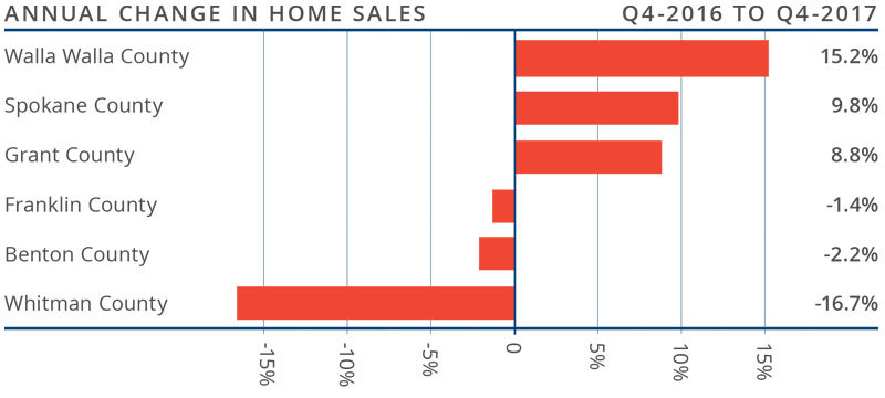 • In aggregate, home sales throughout Eastern Washington performed well in the fourth quarter, with sales rising 6.3% compared to the same quarter of 2016. Year-over-year, home sales rose in three markets and decreased in three. In total, there were 3,469 home sales in the  fourth quarter.