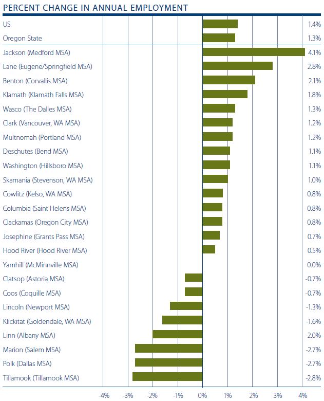 On a year-over-year basis, the Oregon counties covered by this report increased employment by 0.8%, or approximately 14,000 jobs—a modest improvement from the 0.75% annual growth that was discussed in our last report. On a year-over-year basis, 16 counties saw their employment base expand and just eight saw employment contract.