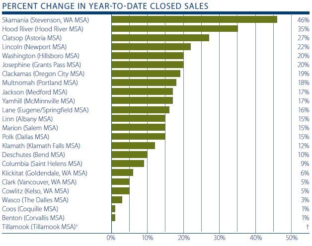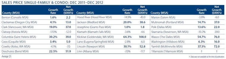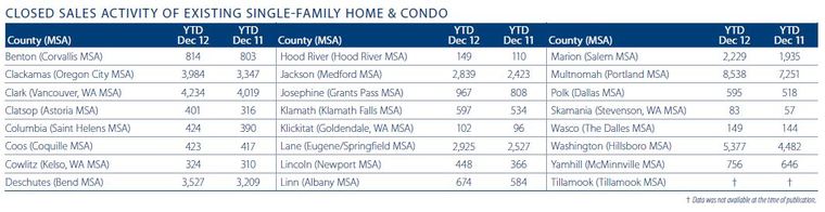 In 2012, the greatest growth in transactions was seen in Skamania County (+46%), Hood River County (+35%), Clatsop County (+27%), and Lincoln County (+22%). It was very pleasing to see that no markets saw sales volumes drop between 2011 and 2012.