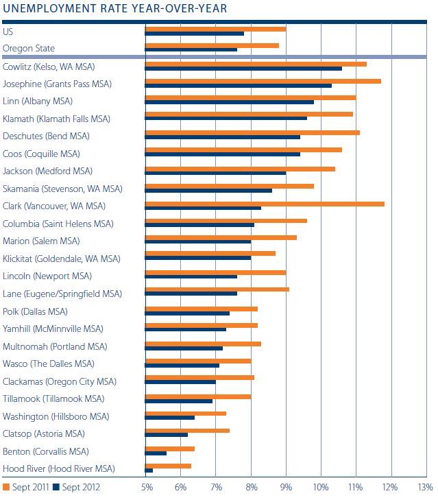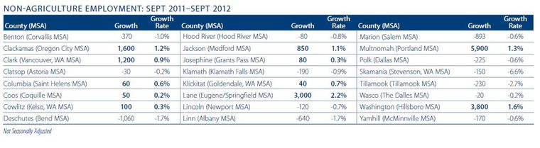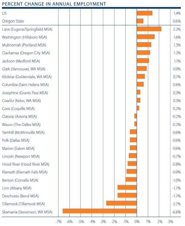 On a year-over-year basis, the Oregon counties covered by this report increased employment by three quarters of a percent, or approximately 12,500 jobs. This is the good news. On a year-over-year basis, 11 counties expanded their employee base and 13 saw employment contracting.