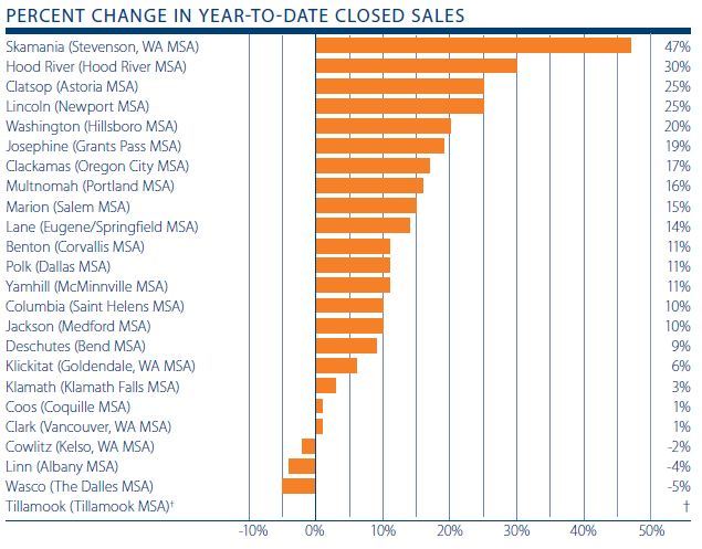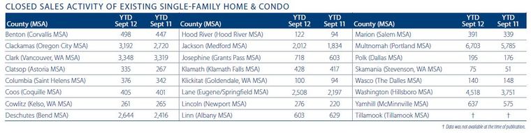 Year-over-year, the greatest increase in sales was seen in Skamania County (+47%), Hood River County (+30%), and Clatsop and Lincoln Counties, which both grew by 25%. Washington County rounded out the top 5 with an increase of 20%. There were three counties where sale volumes dropped from the same period in 2011: Wasco (-5%), Linn (-4%), and Cowlitz (-2%).