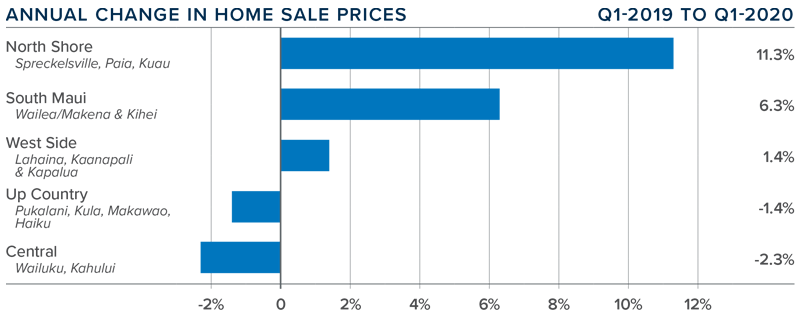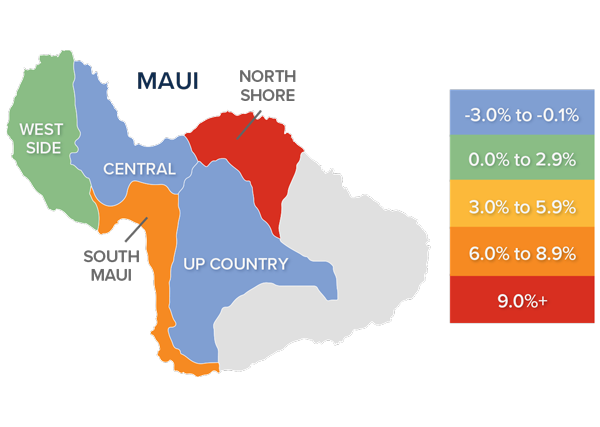 - Price changes on Maui were uneven, rising in three areas and falling in two. There were significant price gains in the North Shore market area.