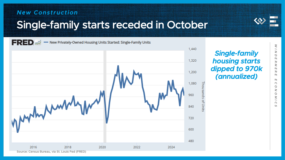 That’s the annualized pace of new single-family construction started in October, according to the latest new residential construction survey released Tuesday, November 19. That’s a big step down from September’s (revised) pace of 1 million, 42 thousand, and generally lower than forecasters were expecting. As you can see here, back in 2021 builders were running at a pace well above 1 million annualized starts, before interest rates climbed and dampened their enthusiasm in 2022.