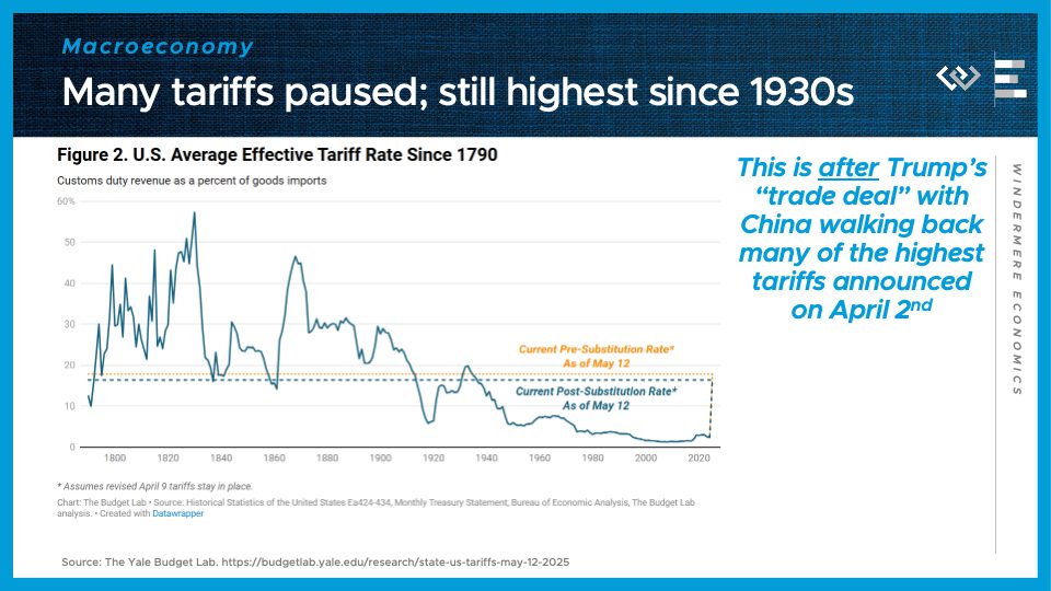 The new average effective tariff rate on US imports, which is down sharply from 27% last month, but still the highest since 1934, and still about 5 times the level prevailing at the start of this year. That’s according to the Yale Budget Lab’s latest estimates as of the week of May 12.