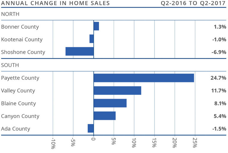 - Sales rose the fastest in Payette County, which saw a 24.7% increase over the second quarter of 2016. There were also noticeable sales increases in Valley County. Home sales fell in Ada County, but the contraction was a modest one.