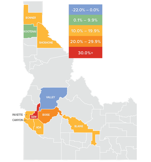 The following analysis of select counties of the Idaho real estate market is provided by Windermere Real Estate Chief Economist, Matthew Gardner. We hope that this information may assist you with making better-informed real estate decisions. For further information about the housing market in your area, please don’t hesitate to contact your Windermere agent.