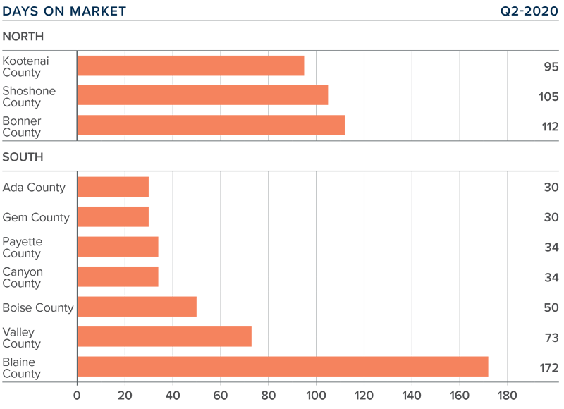 - In Northern Idaho, days-on-market dropped in Bonner County, but rose in the other two counties. In Southern Idaho, market time dropped in four counties, was static in one, and rose in Blaine County.