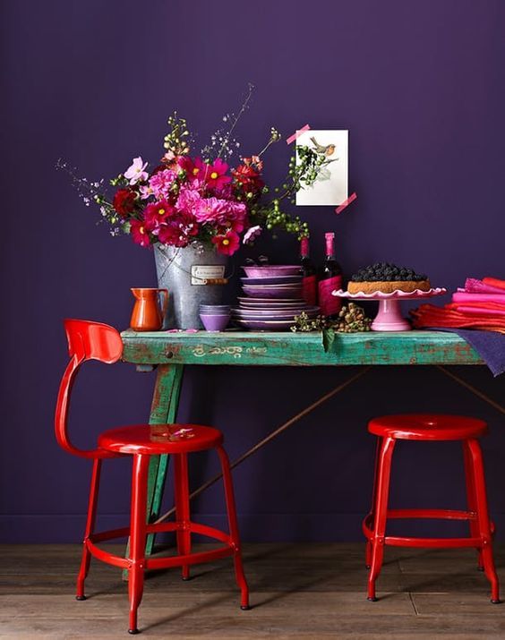 Red bar stools look great in almost any color environment; from a vivid purple dining room, to a cool white-on-white kitchen.