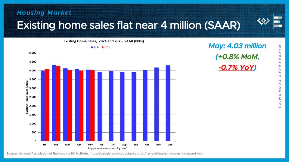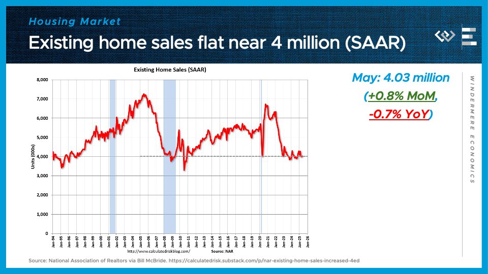 They actually surprised slightly to the upside in May, when closed sales ran at an annualized rate of 4.03 million. That is ever so slightly higher than April’s figure, and ever so slightly lower than in May of 2024, but in both cases it’s less than a percentage point difference – let’s just call it roughly flat. And “flat” pretty much sums up existing-home sales for the last couple of years: outside of some seasonal outperformance this past Q4, we’ve just been bouncing around an annual sales rate of about 4 million.