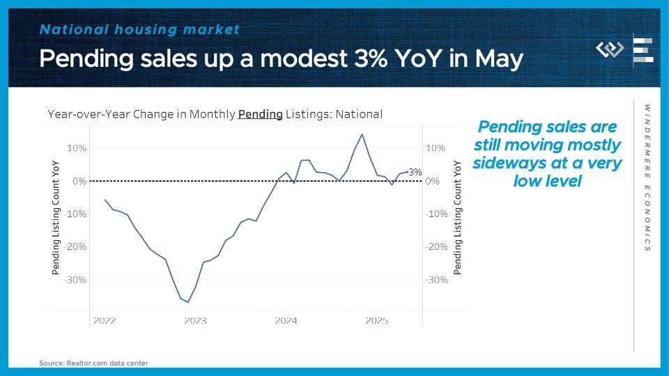 Pending sales ticked up by just under 3% in May, year-over-year. That’s an early indication we may see some modest year-over-year gains for closed sales in June, but the market is still looking quite sluggish.