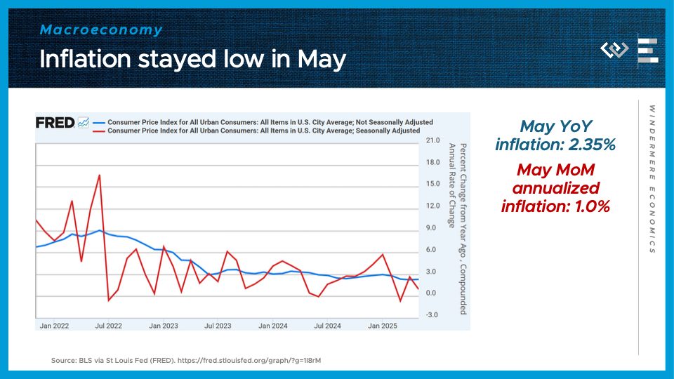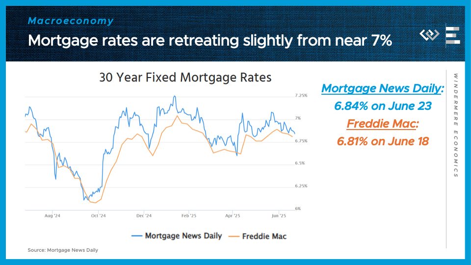 Finally, it’s another pretty quiet month for mortgage rates, which are once again stuck in a range between 6 and ¾, and 7%. It’s been a busy news month, but mortgage rates mostly took it in stride, drifting down slightly in the last couple weeks to end up basically where they were at this time last month. The Federal Reserve declined to change its overnight Federal Funds Rate at its June meeting, but there is growing pressure to resume cutting rates soon, if inflation remains as muted as it has been this spring. Personally, I still think the Fed will wait till clearer signs of labor market deterioration before cutting; moreover, a growth slowdown is probably what bond traders need to see before long-term yields like mortgage rates fall substantially.