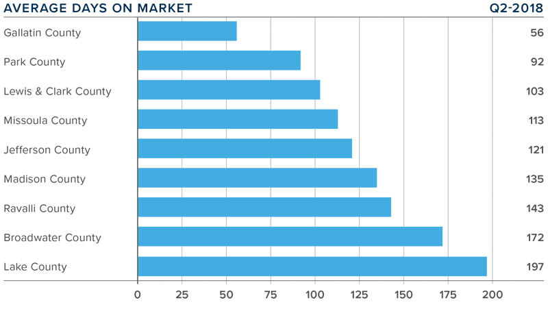 - Homes sold fastest in Gallatin County and slowest in Lake County. In four counties — Missoula, Broadwater, Gallatin, and Park — days on market rose when compared to the second quarter of 2017.