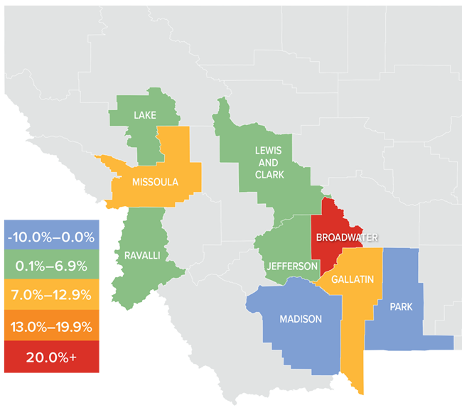 - Price appreciation was strongest in Broadwater County, where home prices rose by a substantial 27.2%. Although this sounds extreme it is a very small market and subject to major swings.