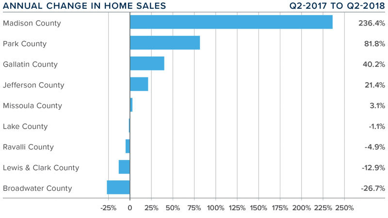 - Total sales activity rose in five of the counties analyzed in this report. The largest increase was in Madison County, which had a substantial 236.4% increase, from 22 home sales to 74. Sales contracted in the four remaining counties with the greatest decline in Broadwater County, where sales were down 26.7% (representing a drop of only eight units).