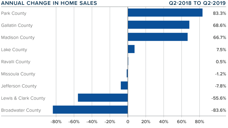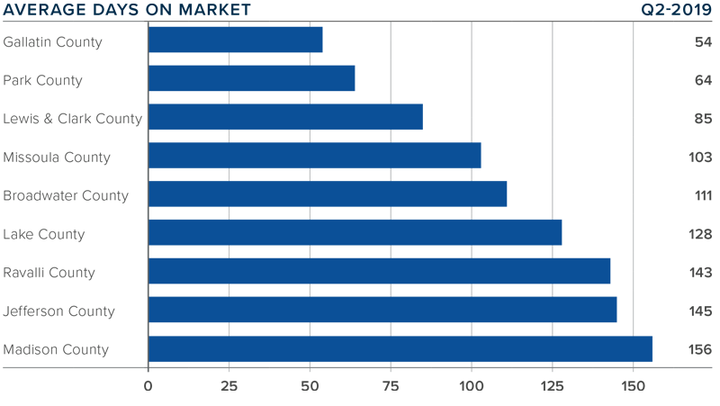 - Homes sold fastest in Gallatin County and slowest in Madison County. Five counties — Missoula, Lake, Broadwater, Gallatin, and Park — saw days-on-market drop compared to the second quarter of 2018.