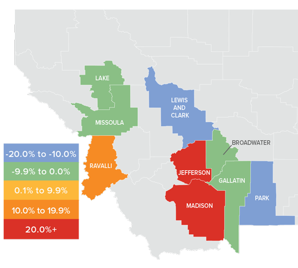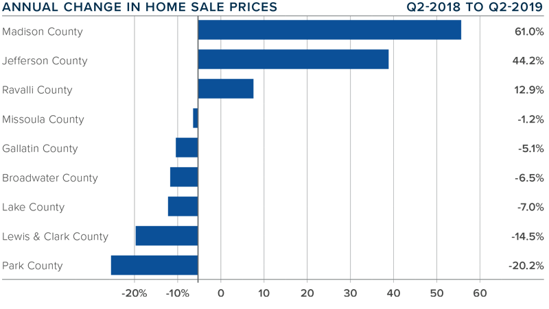 - In addition to Madison County, Jefferson and Ravalli counties also saw double-digit price increases. Average prices dropped in the rest of the counties contained in this report, with the largest drop in the small Park County. This is a function of the size of the market and the relatively few transactions that occur there.
