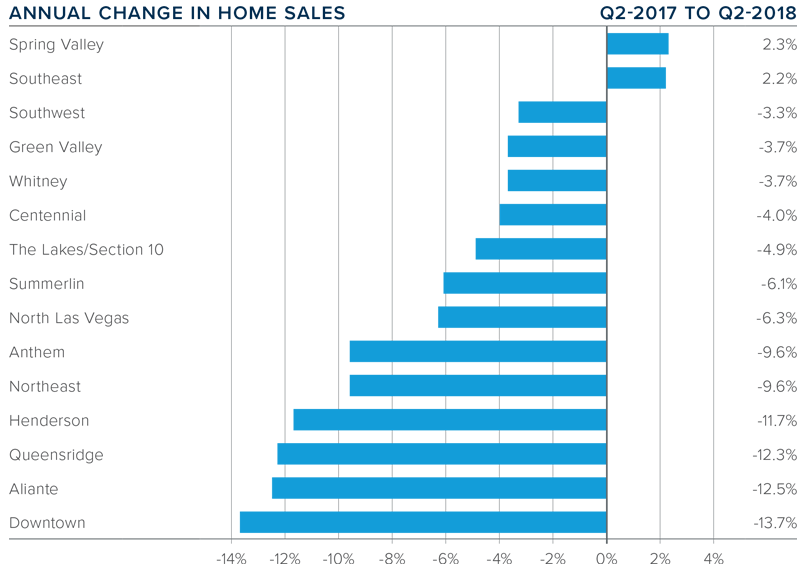- Sales rose in only two sub-markets compared to a year ago, with the Spring Valley and Southeast Las Vegas markets each rising by a little over 2%. All other markets saw sales decline, the most substantial of which was in the Downtown sub-market.