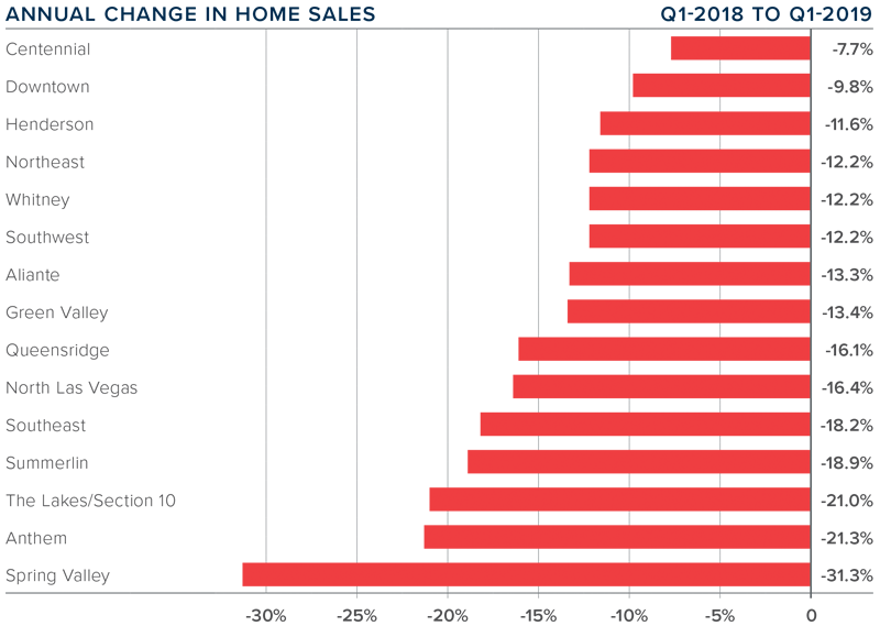 - Sales dropped across the board, with the most substantial dip occurring in the Spring Valley neighborhood. Double-digit contractions in sales were seen in all areas other than the Centennial and Downtown neighborhoods.