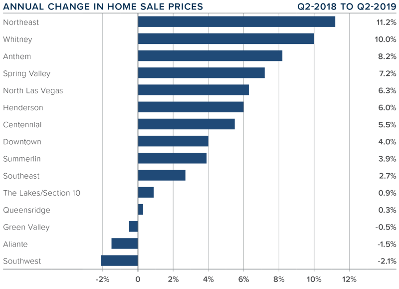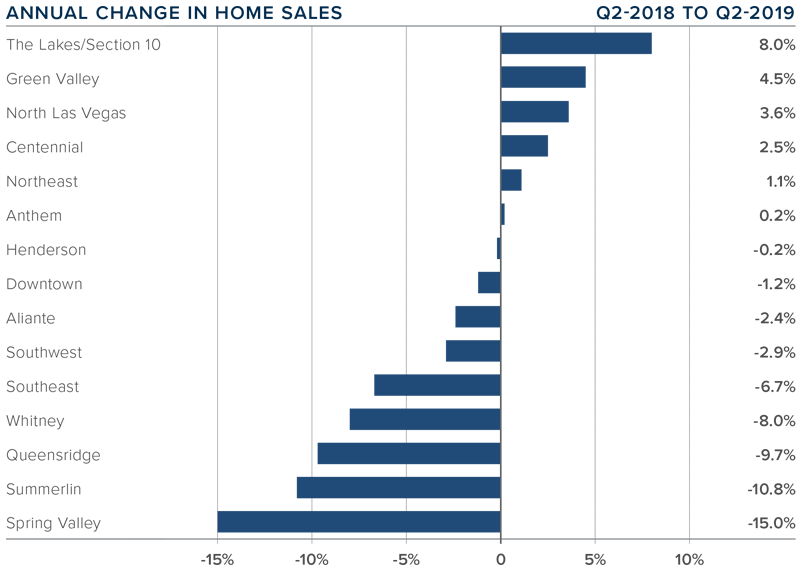 - Home sales rose the most in the Lakes/Section 10 neighborhood. There were also decent increases in the Green Valley and North Las Vegas markets.