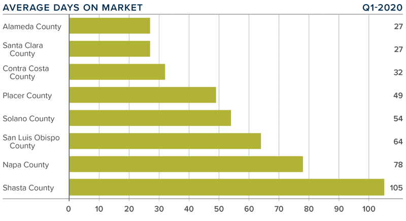 • The average time it took to sell a home in the Northern Californian counties covered by this report dropped five days compared to the first quarter of 2019.