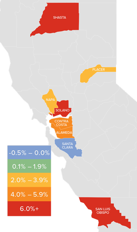 • Average prices rose in all counties other than Santa Clara, which is not surprising given it is the most expensive market covered in this report. Prices across most counties rose at above-average long-term rates, with impressive increases in San Luis Obispo and Solano counties.