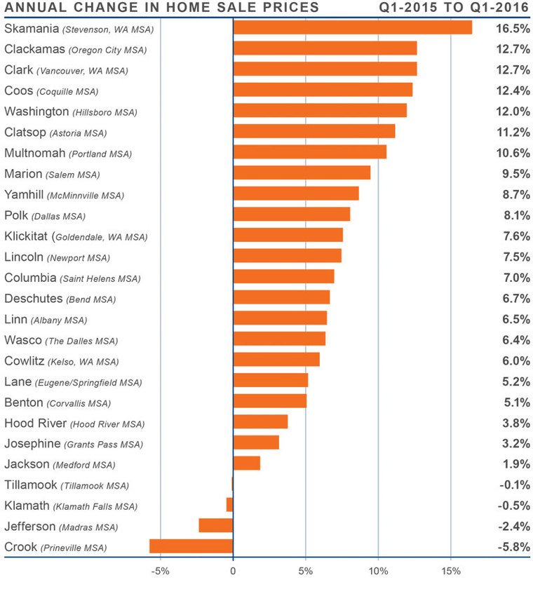 - Double-digit growth was seen in Clackamas, Clark, Coos, Washington, Clatsop and Multnomah Counties, demonstrating that markets close to urban centers, as well as smaller counties, can show fast price appreciation.
