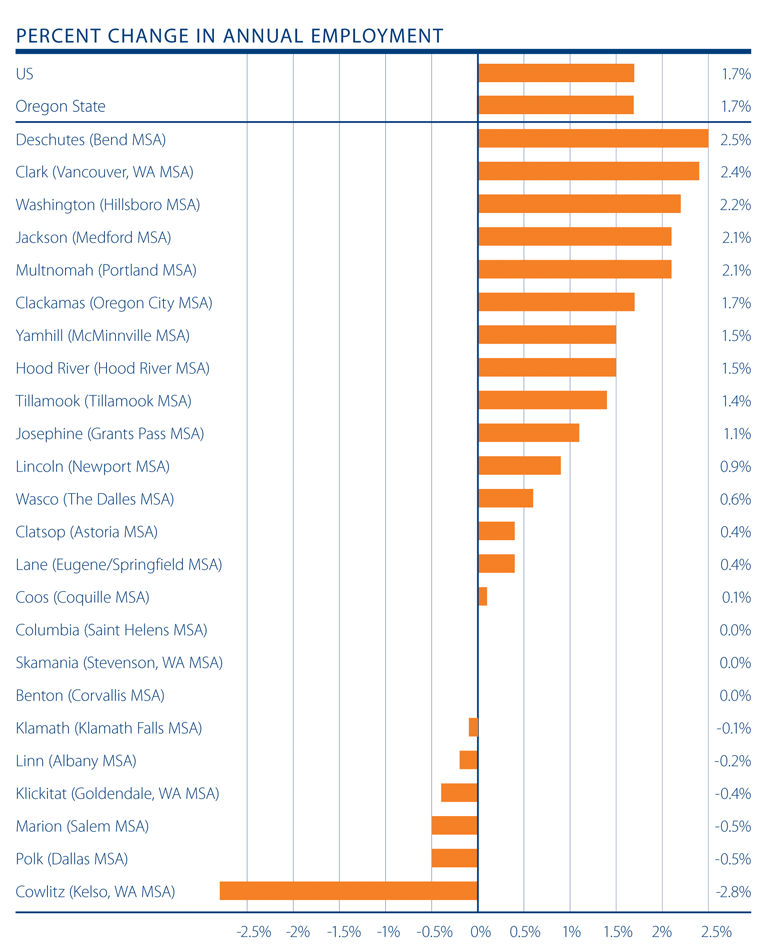 Washington (+2.2%), and Multnomah and Jackson Counties, both of which saw an increase of 2.1 percent. On an absolute basis, Multnomah County maintains its position as the driving force behind job growth with the addition of 9,200 positions over the past 12 months. This was again followed by Washington County (5,500) and Clark County where employment grew by 3,100 positions.