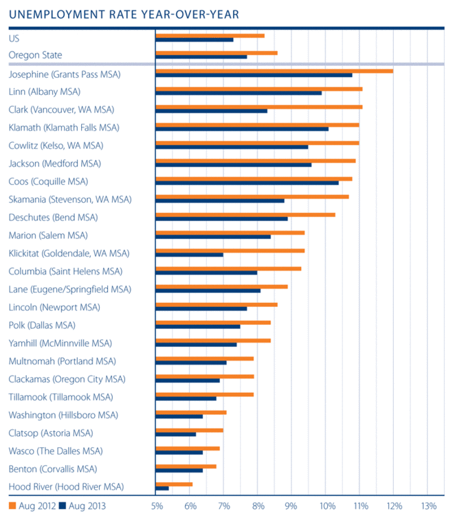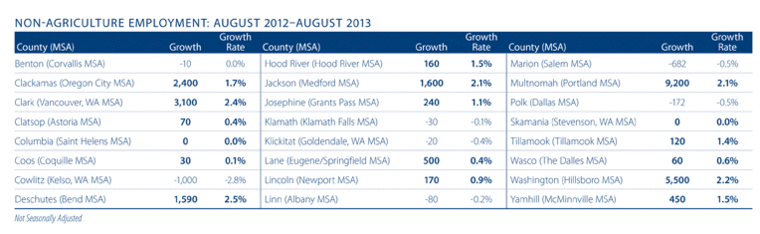 When compared to August of 2012, employment growth was most pronounced in the Bend area (+2.5%). This was followed by Clark (+2.4%),